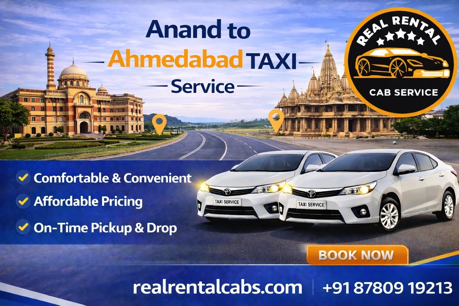 RealRentalCabs provides Anand to Ahmedabad taxi Service one-way as well as round-trip taxi services with clean and well-maintained vehicles, experienced drivers who are familiar with both cities, and an upfront confirmation of fare so that there is no discussion at the point of drop.