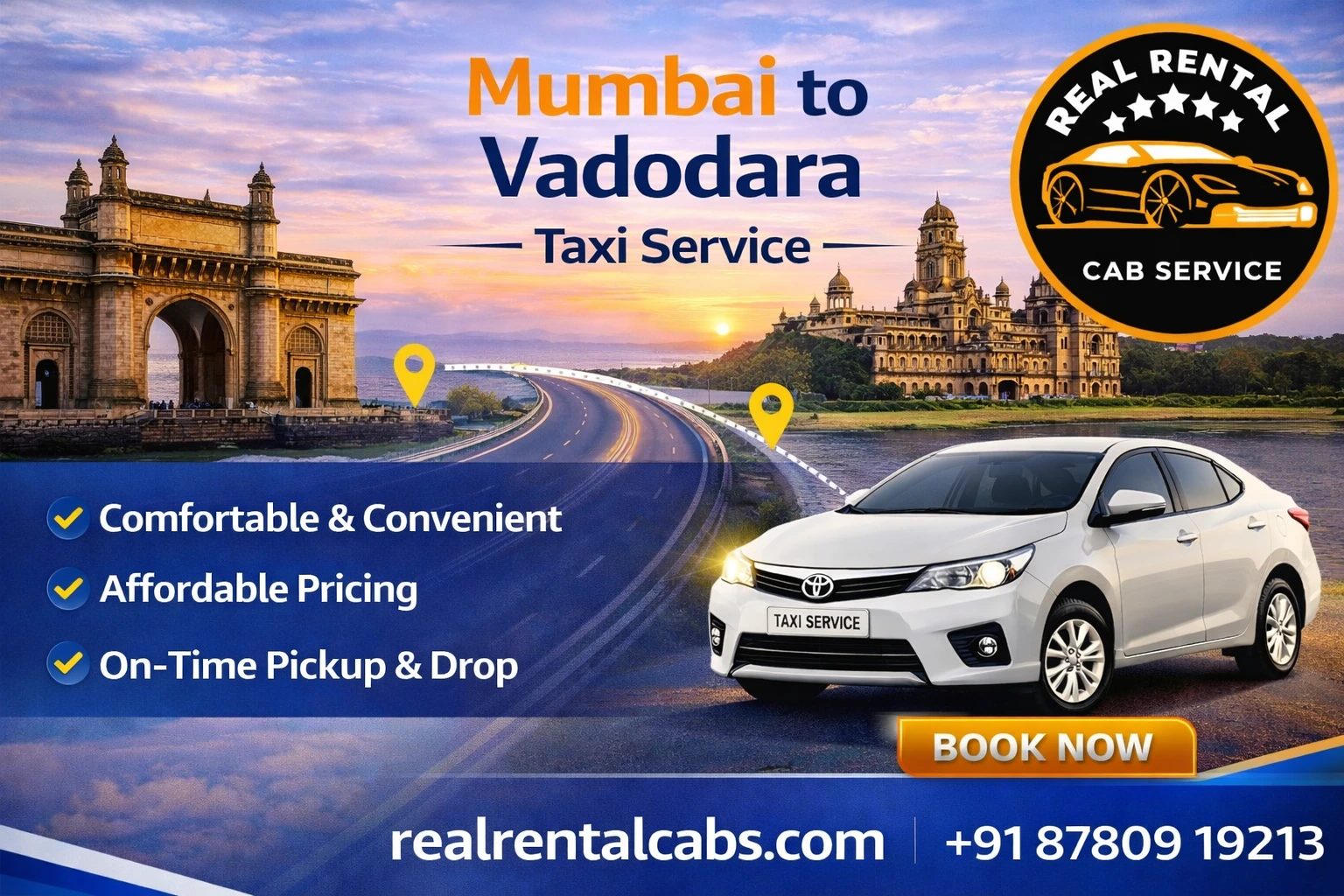 RealRentalCabs provides Mumbai to Vadodara Texi Service one way as well as round trip taxi service, with drivers that handle the route on a regular basis, in well maintained cars for 9-hour trips with a price that is confirmed prior to the journey begins.