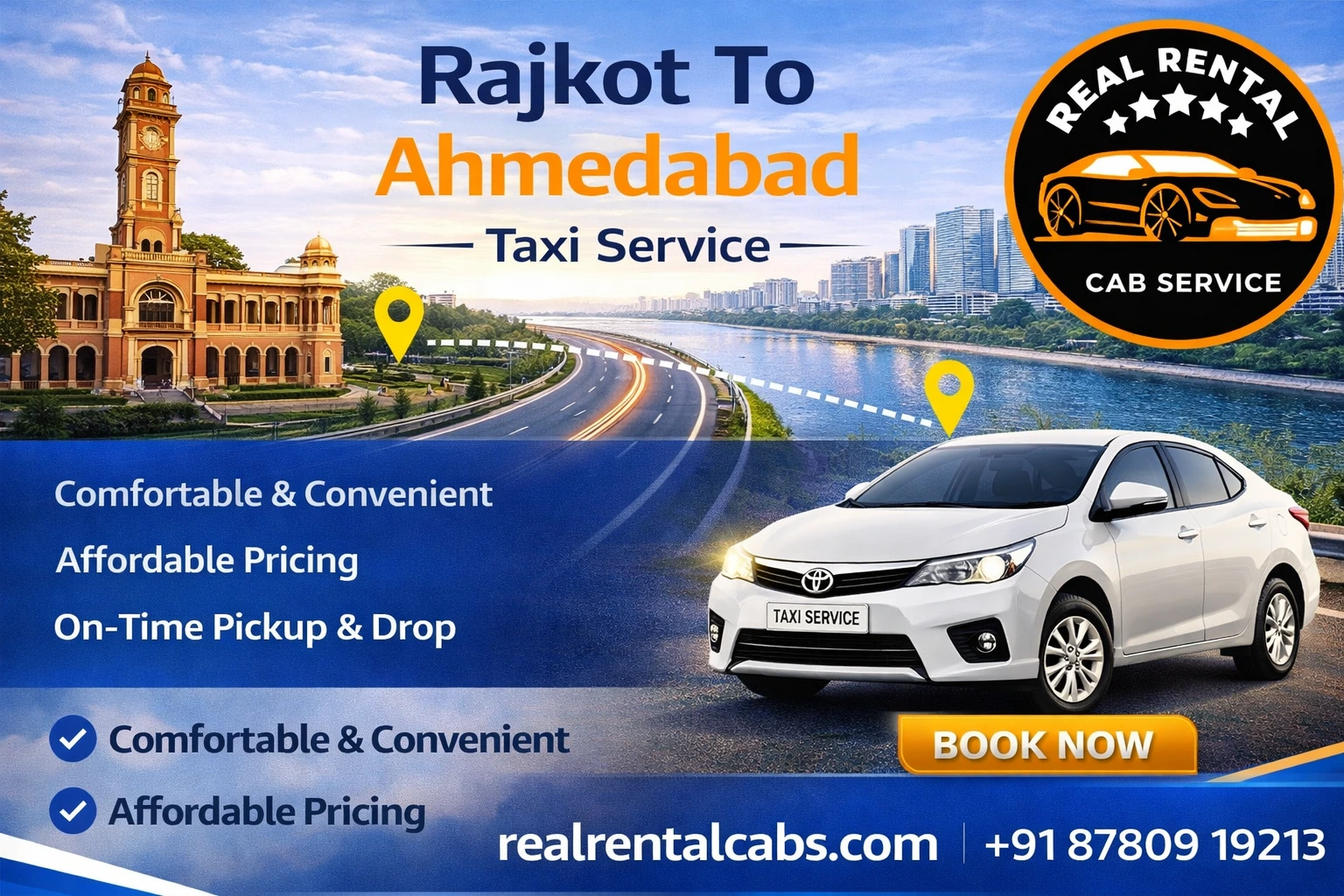 RealRentalCabs offers Rajkot to Ahmedabad taxi service one-way as well as round trip taxi service with knowledgeable drivers for this route, clean and well-maintained vehicles, and a transparent fare that means no surprise at the drop-off location.